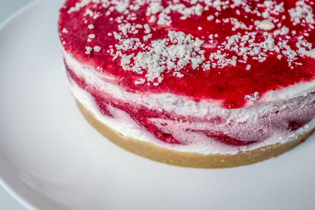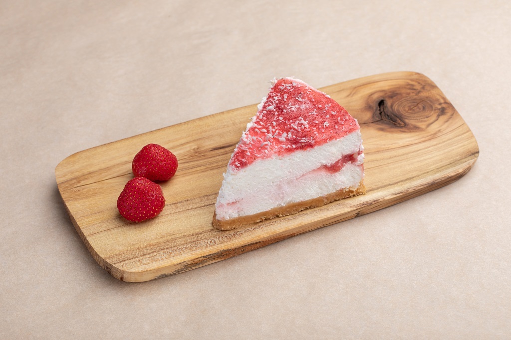 Основа из крошки печенья с маслом сливочным с прослойкой творожного сыра, крема на растительных маслах, ягод клубники, сметаны, сахарной пудры, желатина
