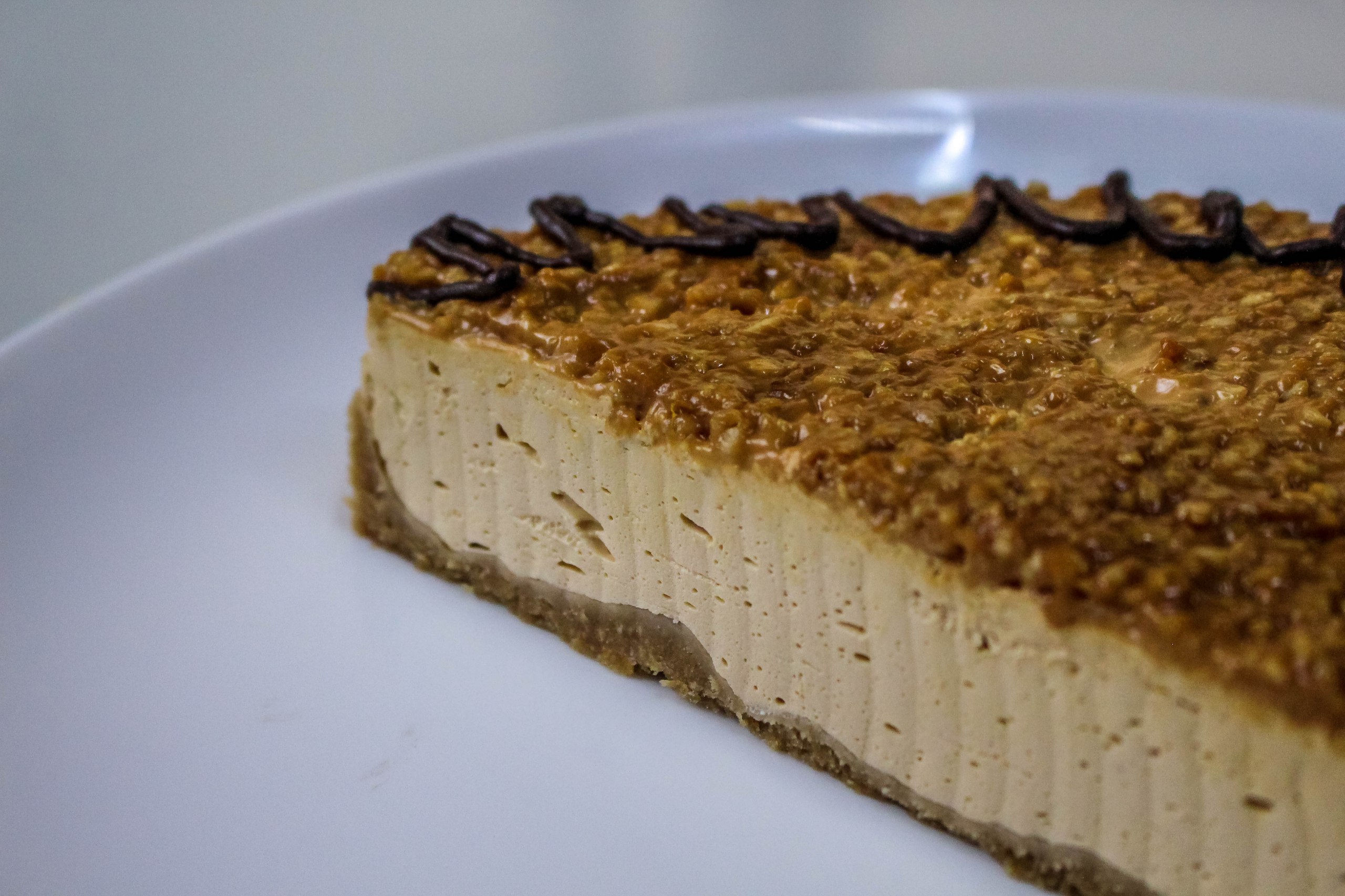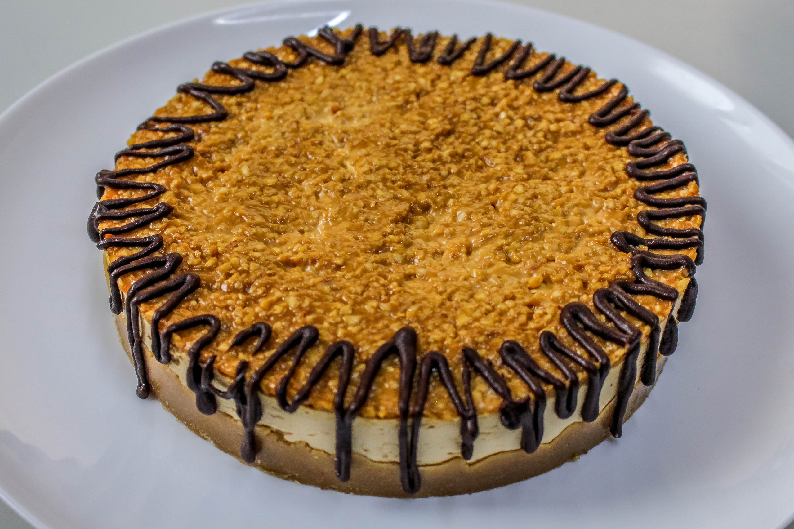 Основа из крошки печенья с маслом сливочным, начинка из молока сгущенного вареного, арахис дробленый, сыра творожного, сметаны и желатина, шоколадной глазури.