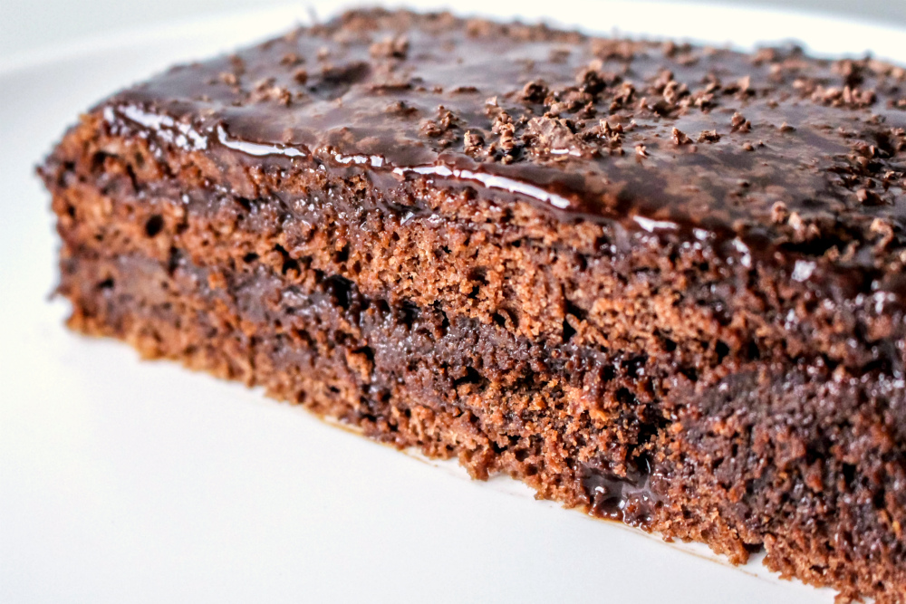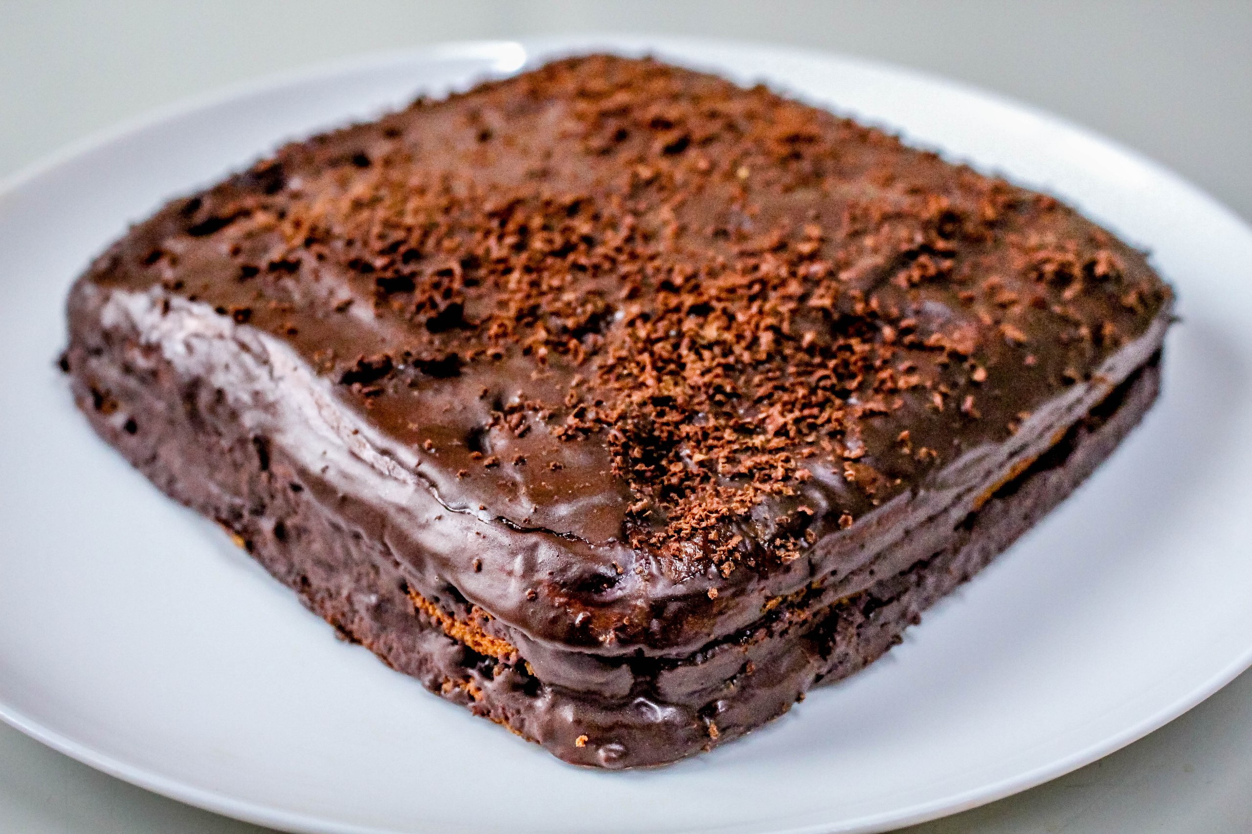 Выпеченный шоколадно-масляный бисквит пропитан сиропом из молока, сахара и какао-порошка