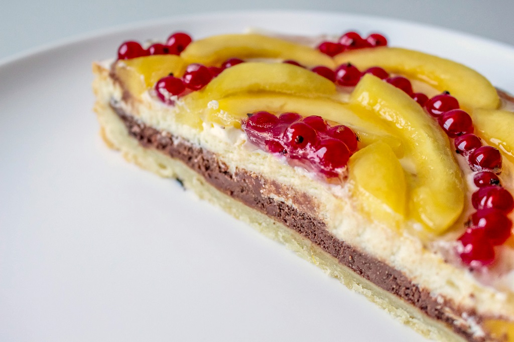 Песочная основа с шоколадной и творожной прослойкой из сыра рикотта, яйца куриного, крупы манной, шоколада и фруктов