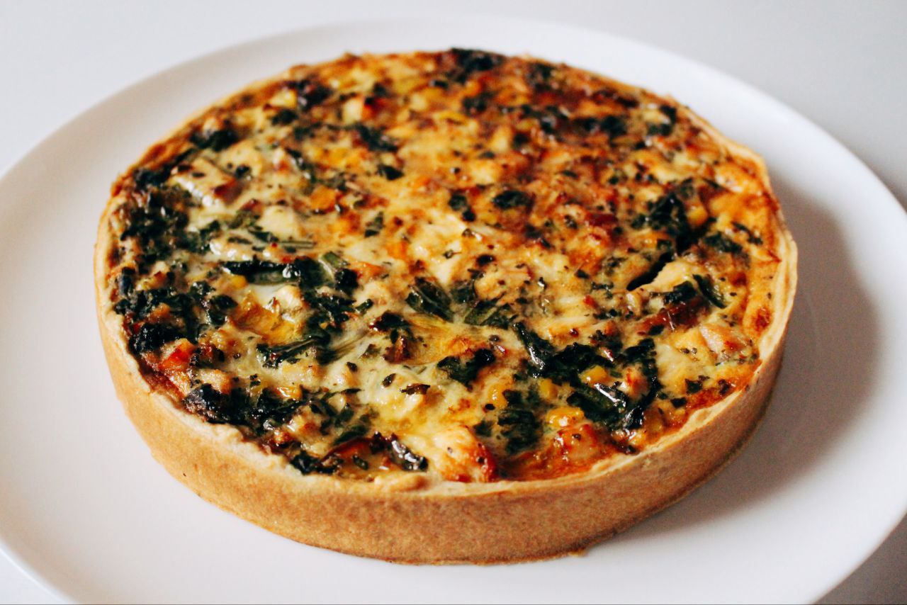 Песочное тесто, мякоть копченой курицы, кукуруза, шпинат, перец, сливочно-сырный соус, специи