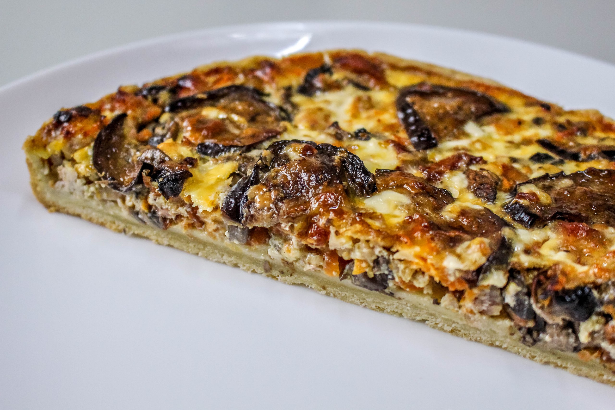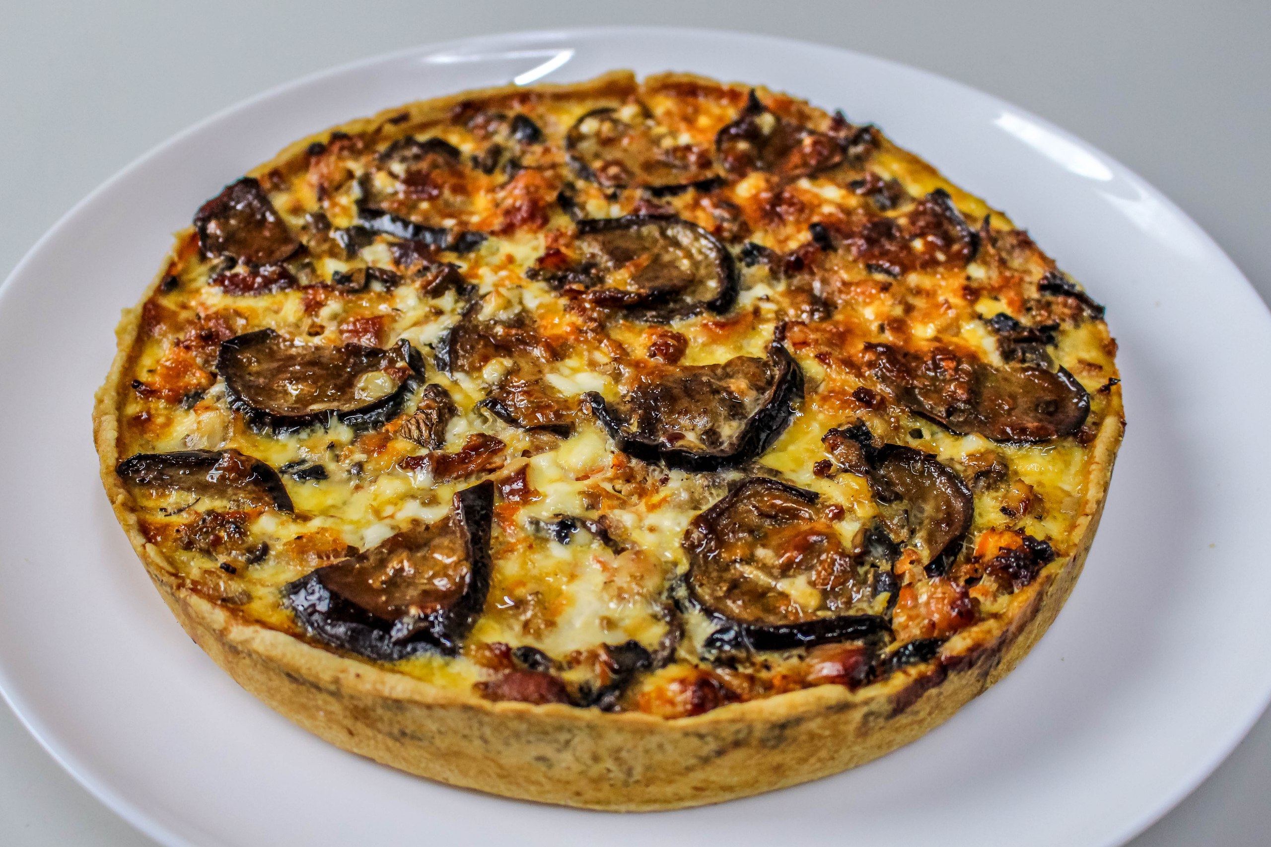 Песочное тесто, мякоть копченой курицы, баклажаны, шампиньоны, морковь, французская горчица, сливочно-сырный соус, специи