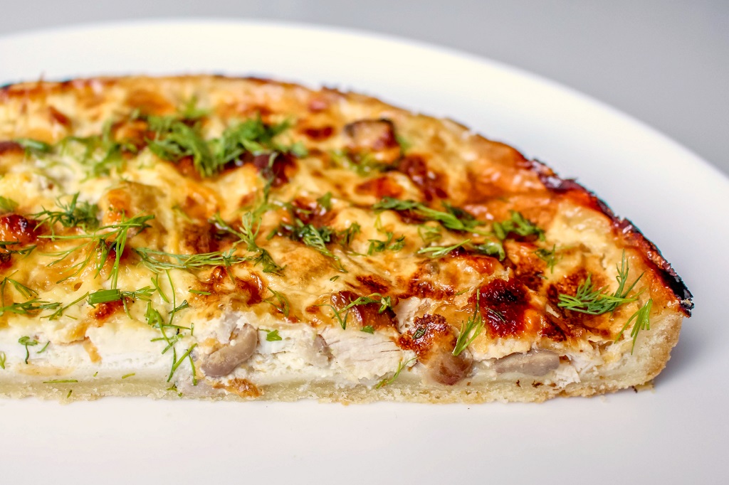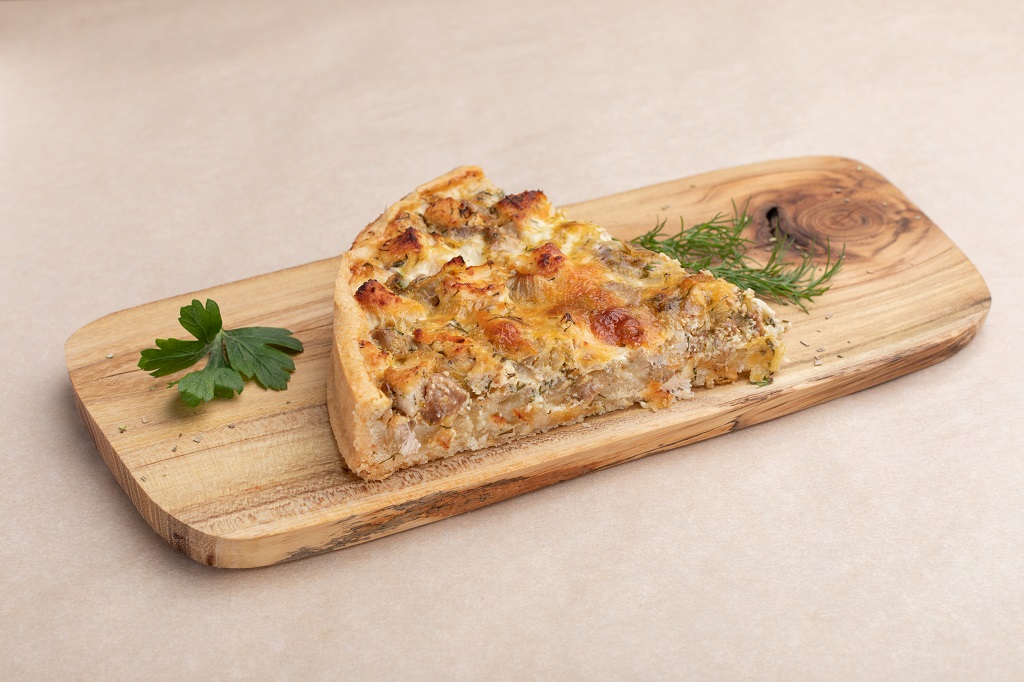 Песочное тесто, начинка из филе курицы, шампиньонов, лука, сливочно-сырной заливки и специй