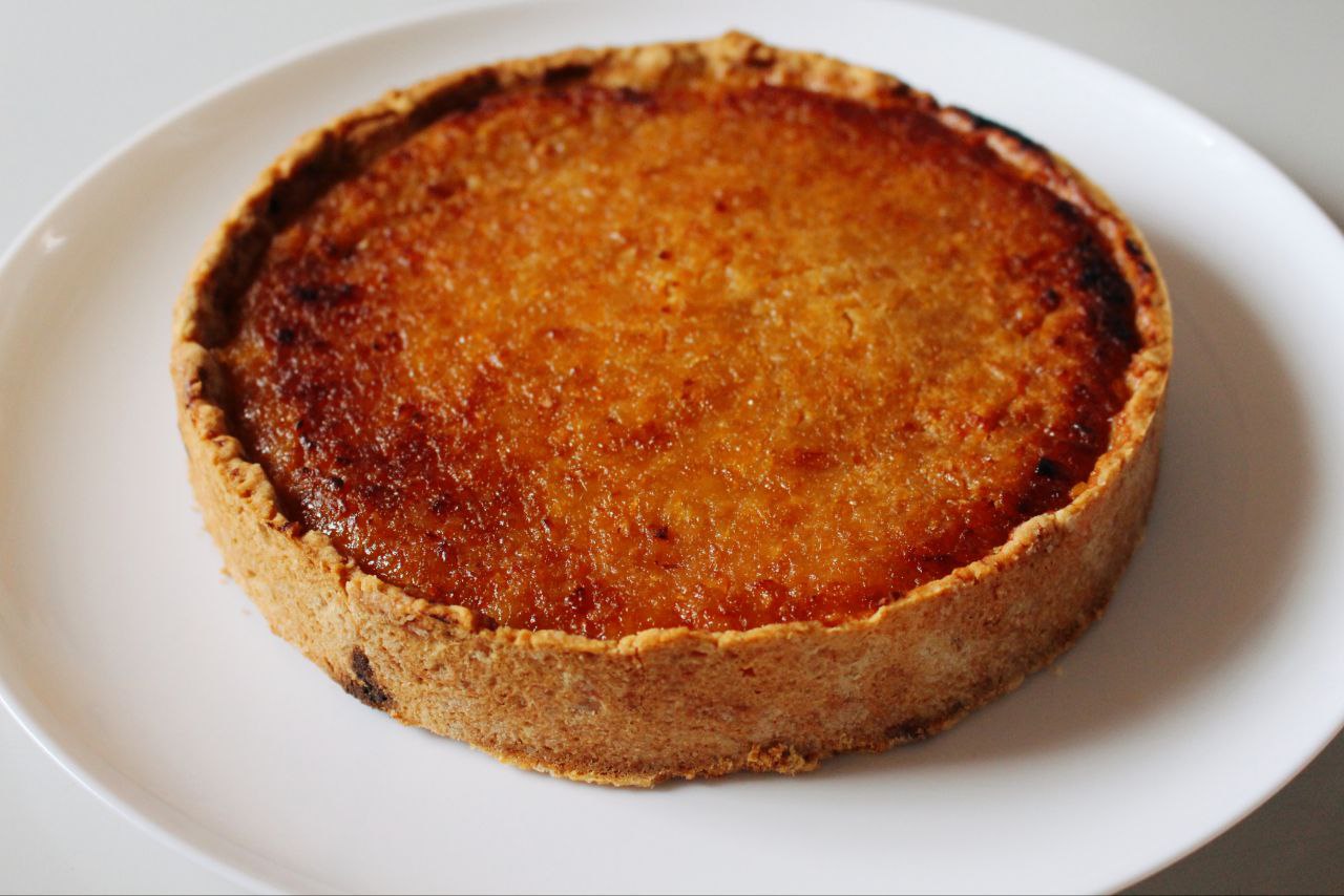 Сладкое песочное тесто, начинка сметана со сгущённым молоком.