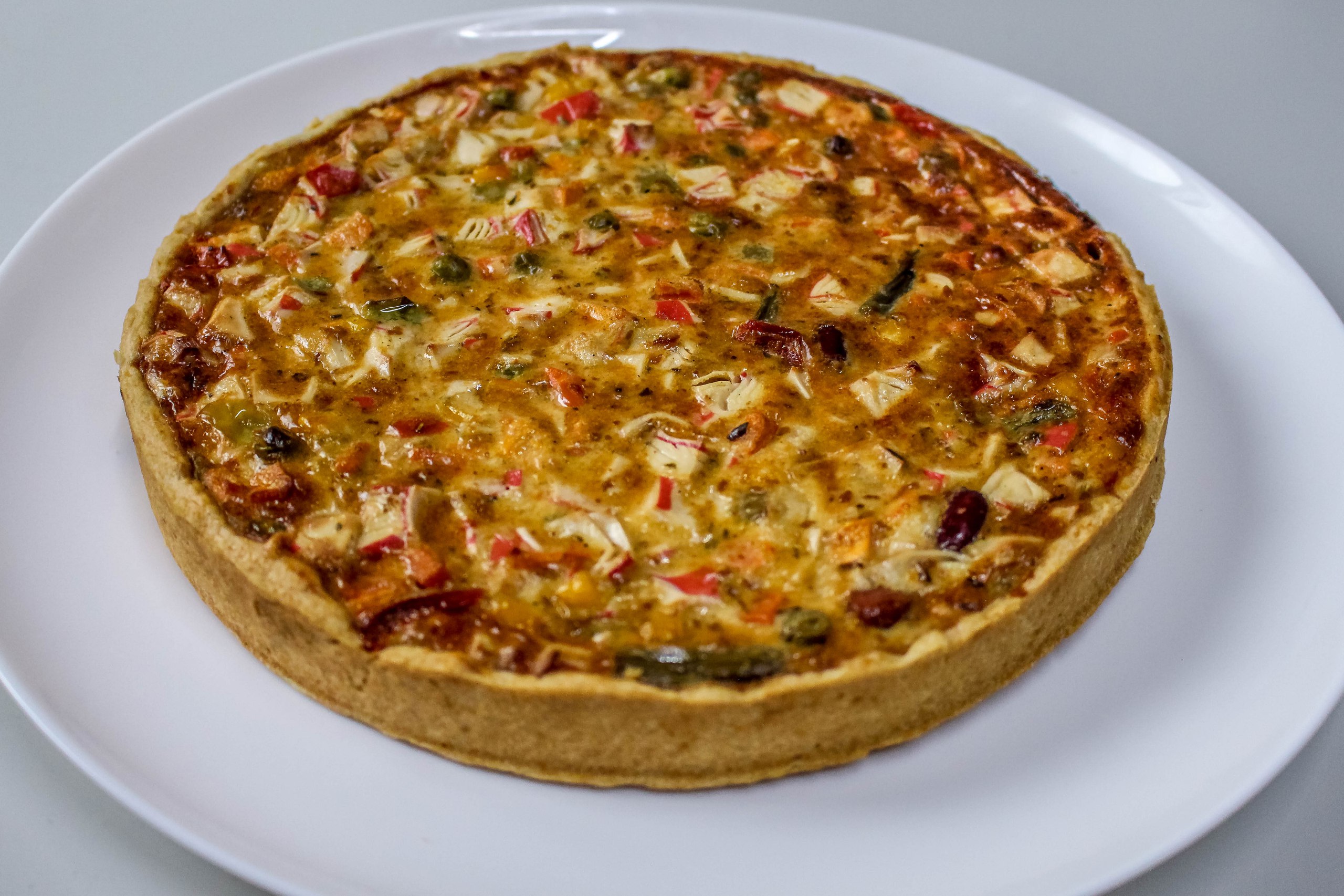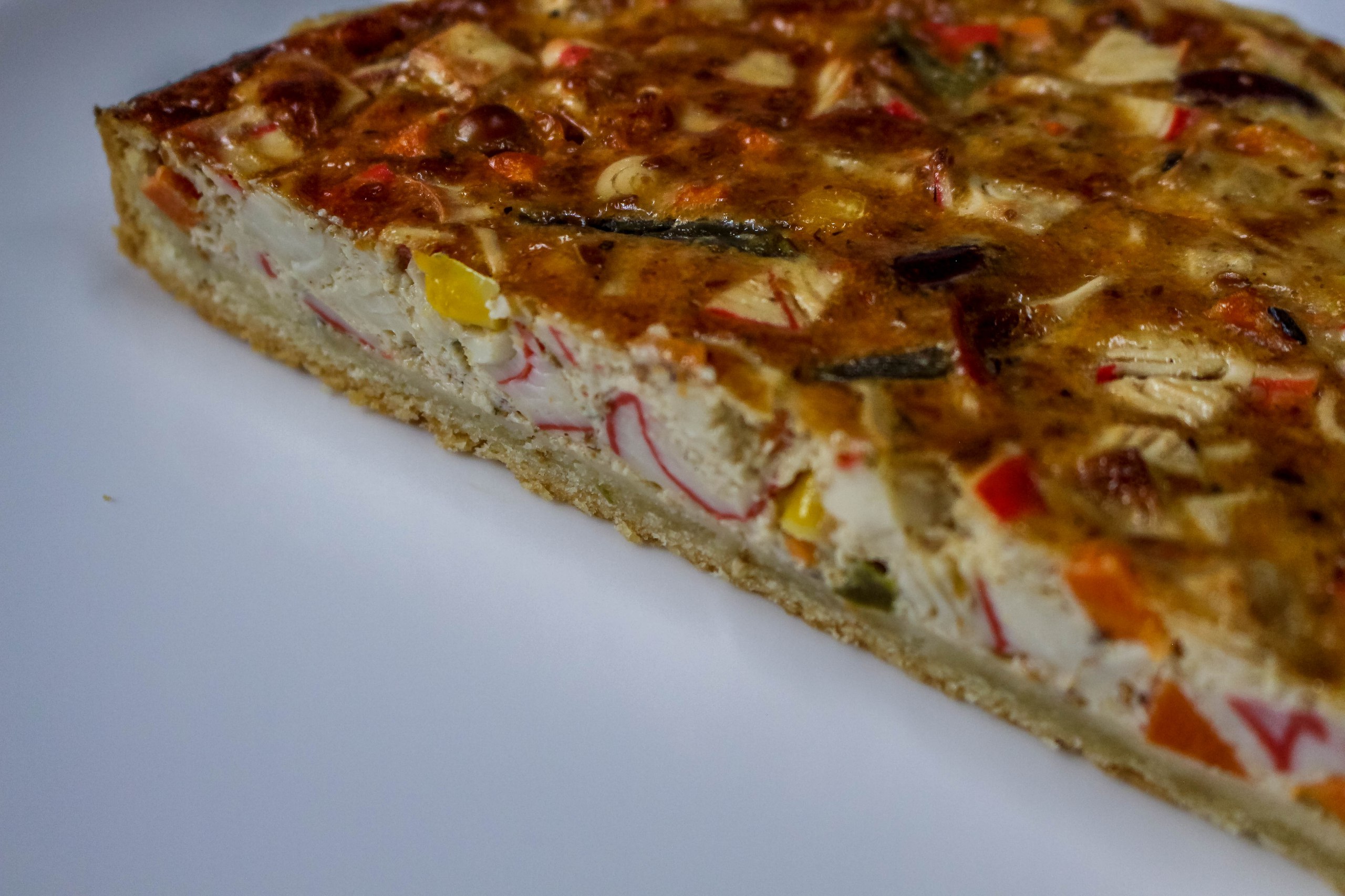 Песочное тесто, овощная смесь, крабовое мясо, яйцо куриное, чеснок и кунжутно-майонезный соус, специи