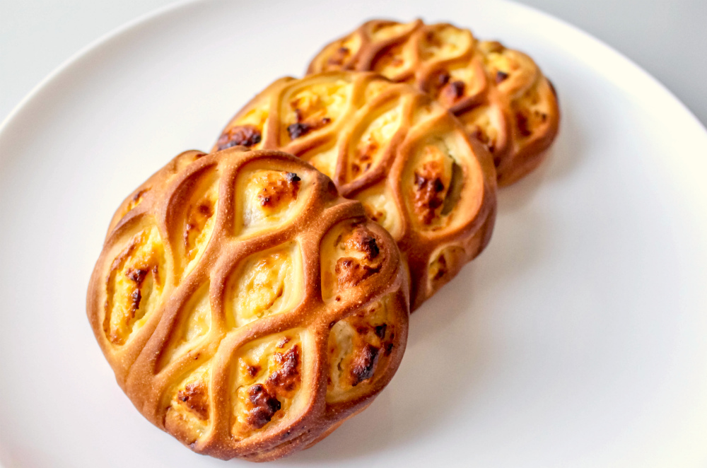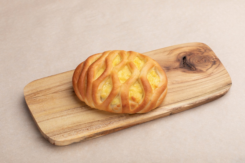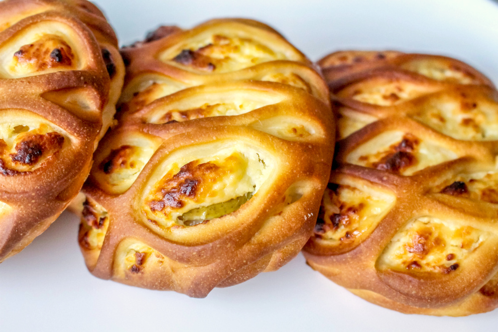 Сдобное дрожжевое тесто, творожная начинка, груша, корица молотая.