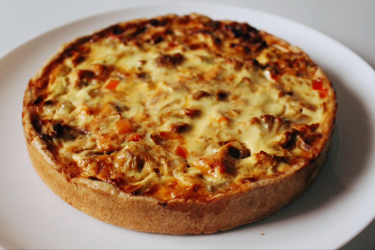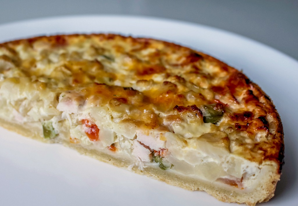 Песочное тесто, капуста цветная, филе курицы, перец болгарский, лук и сливочно-сырный соус
