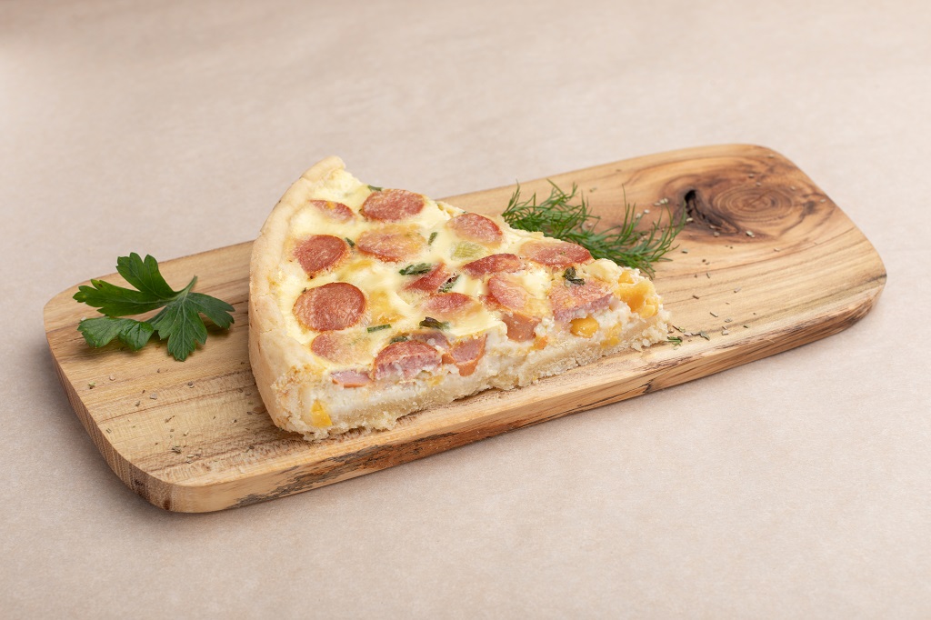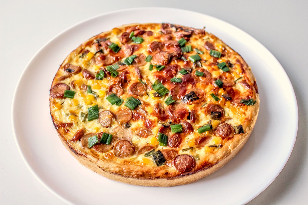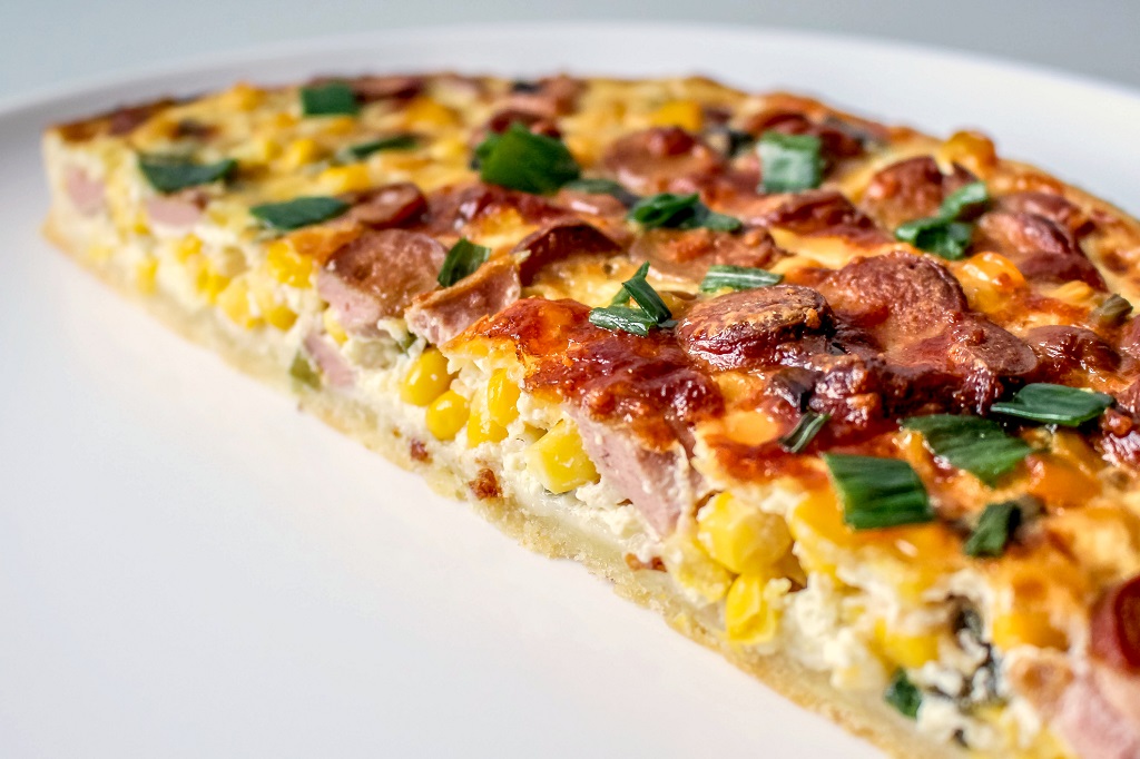 Песочное тесто, колбаски охотничьи, кукуруза консервированная, зеленый лук, сливочно-сырный соус и специи