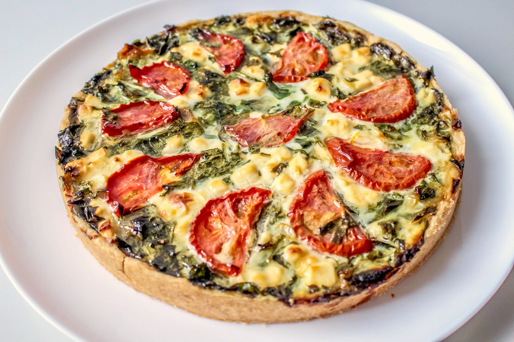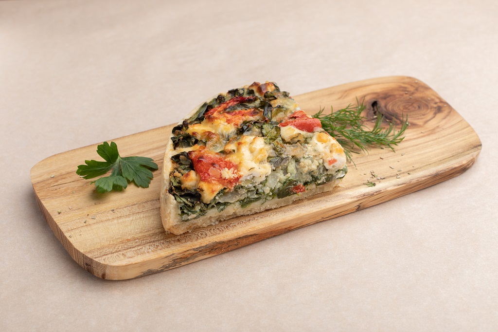 Песочное тесто, начинка из шпината, лука, сыра фета, свежих томатов и сливочно-яичного соуса