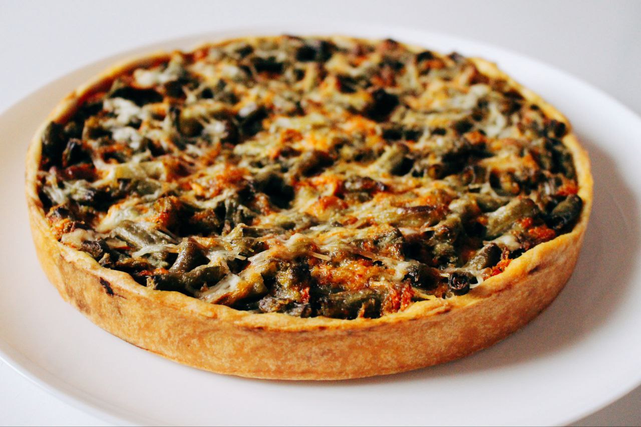 Тесто песочное постное, фасоль спаржевая, морковь, лук, чеснок, специи и постный майонезный соус