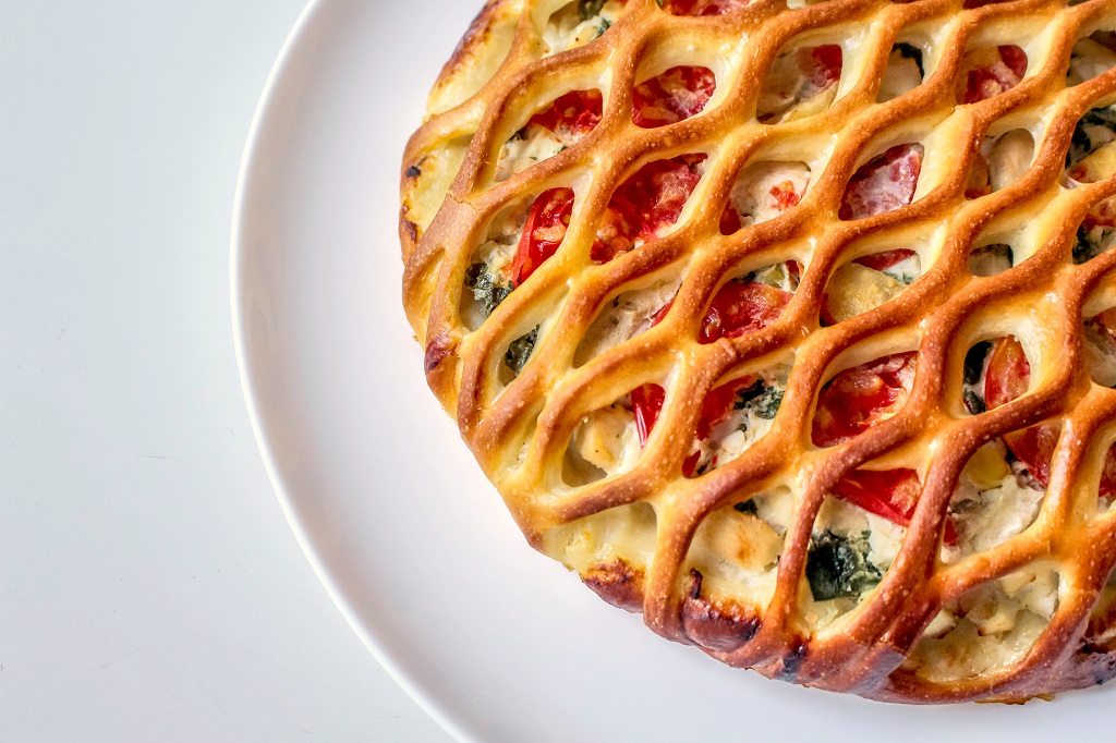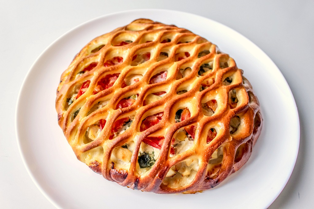 Сдобное дрожжевое тесто, начинка из филе цыпленка, шпината, сыра, яйца, лука, специй