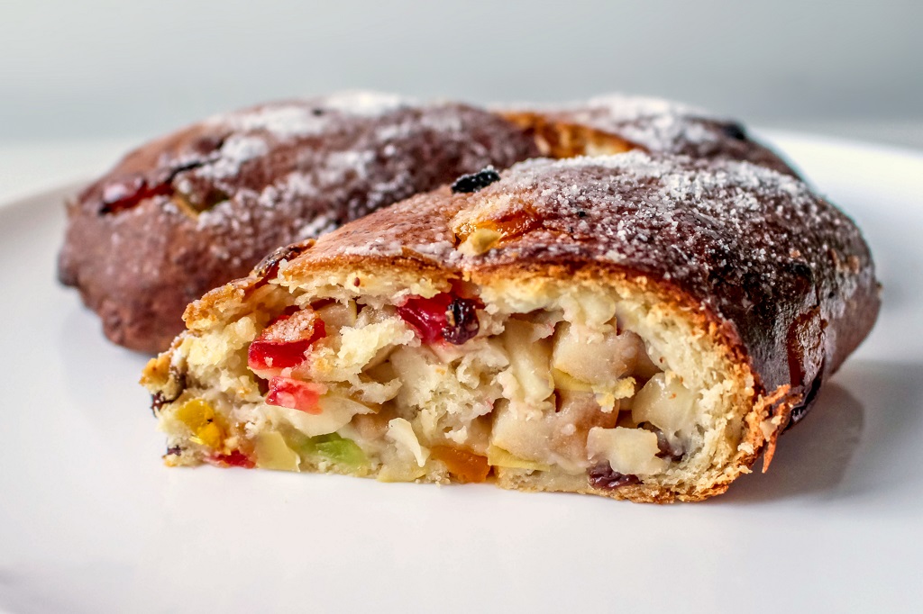 Сдобное творожно-дрожжевое тесто с добавление цукатов, сушеного винограда и свежих яблок