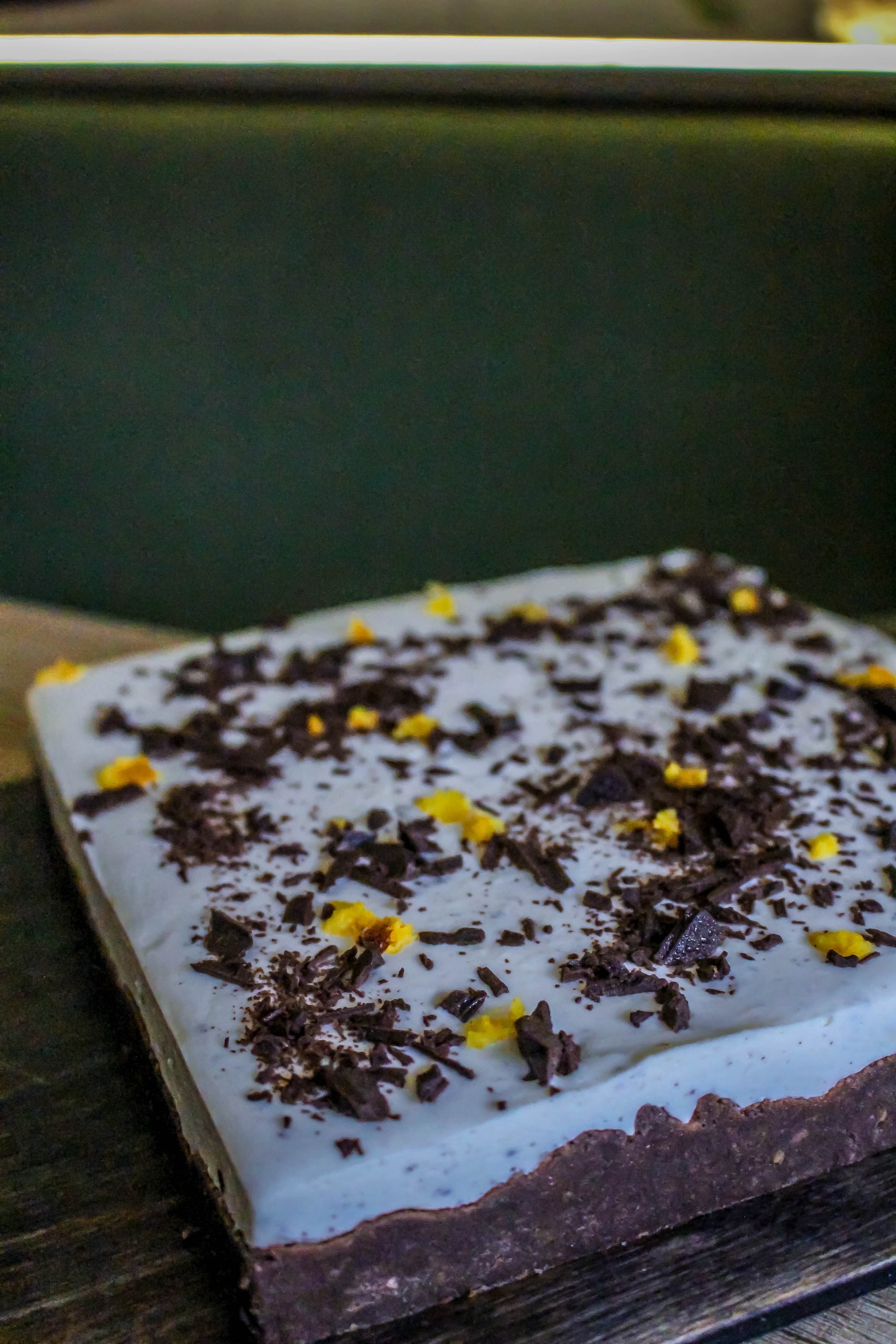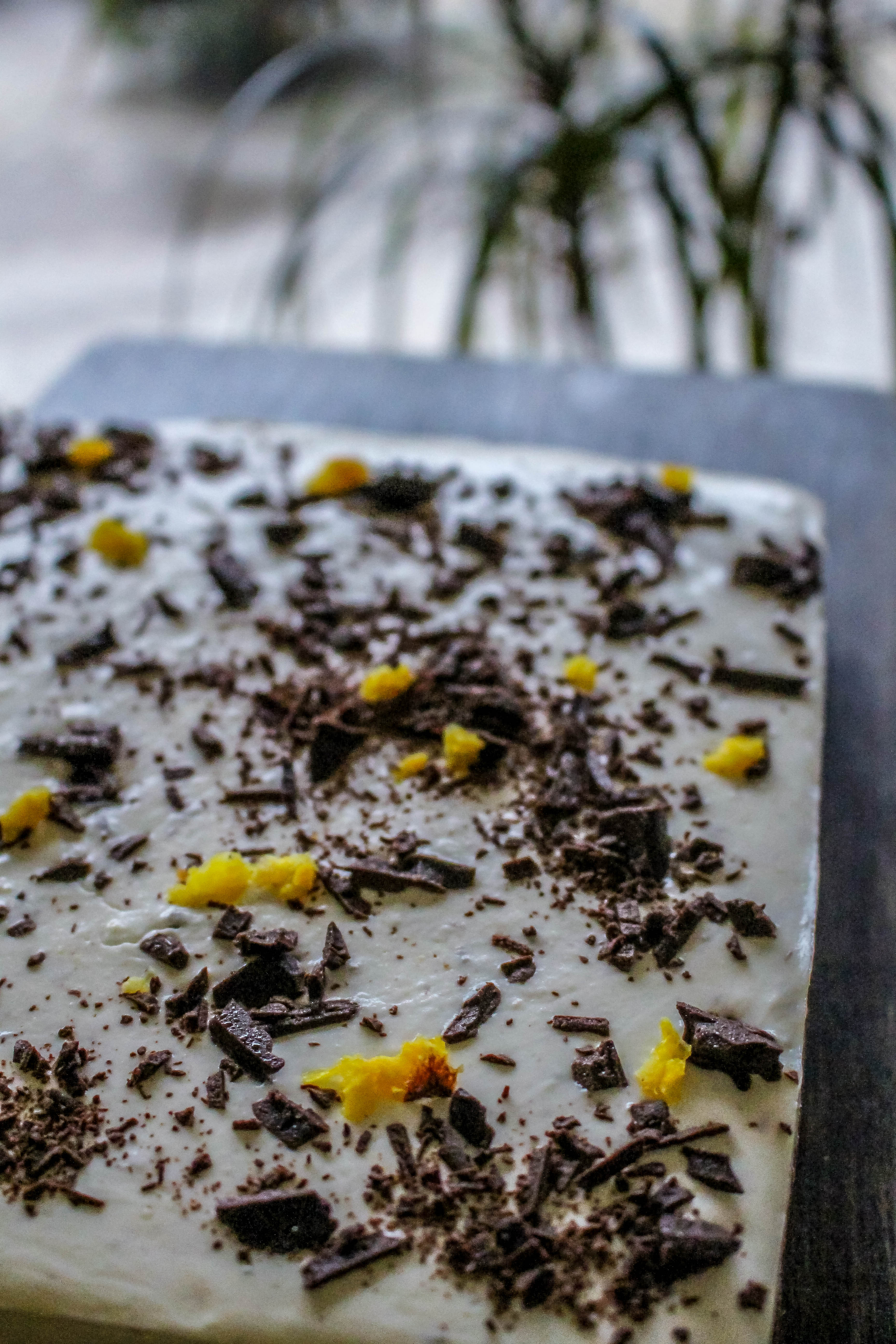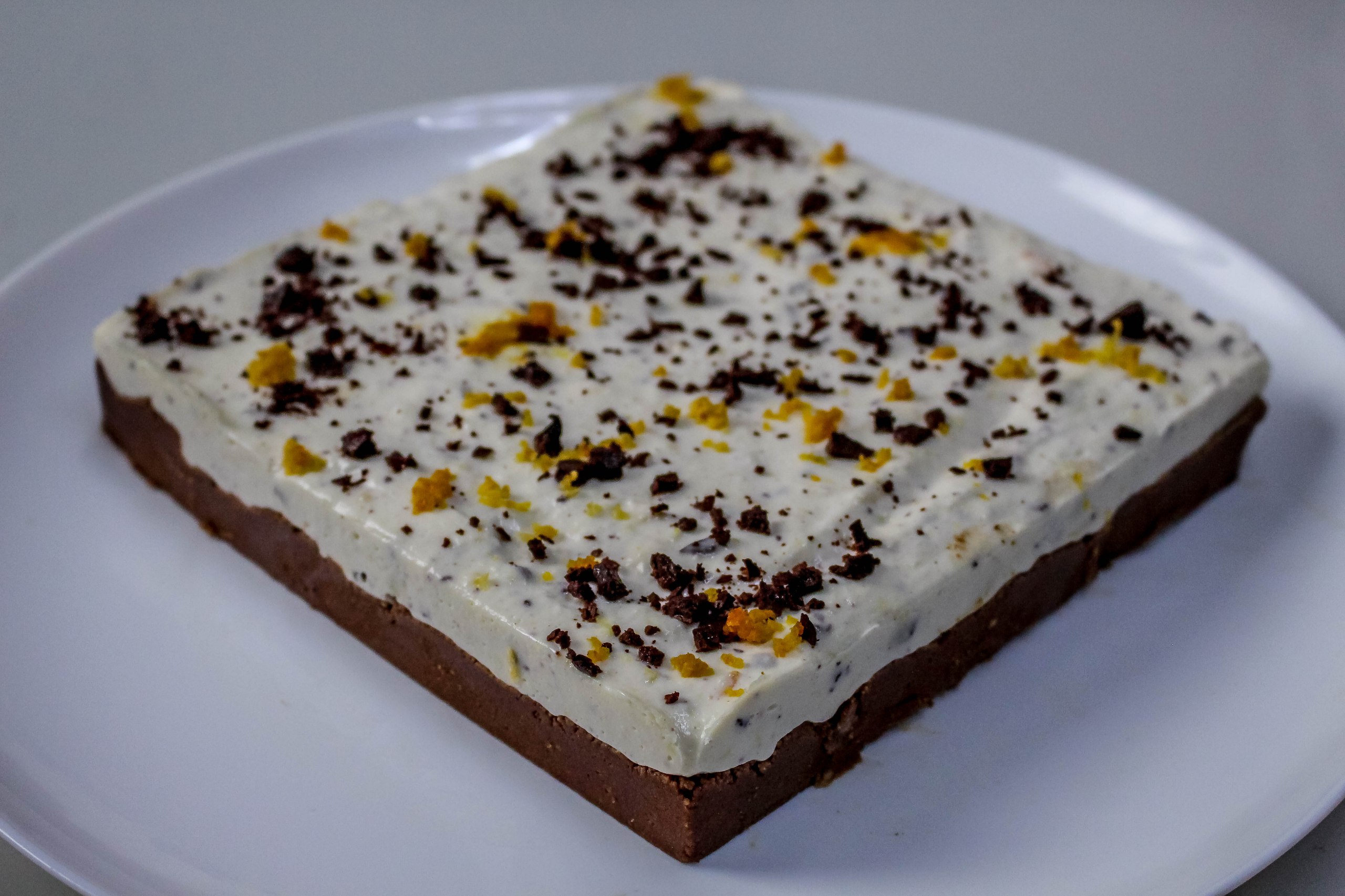 Основа из крошки печенья с маслом сливочным и какао; сметана, сахарная пудра, шоколад, апельсин свежий и желатин